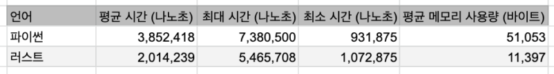 메모리 사용량은 파이썬이 러스트 보다 4.5배 정도 더 사용했다.